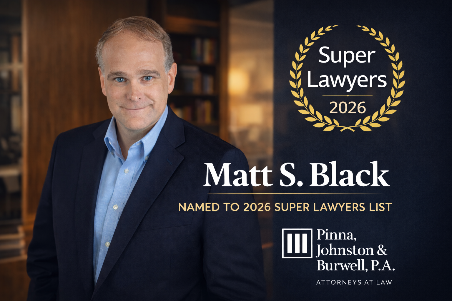 Pinna, Johnston & Burwell, P.A. is pleased to announce that attorney Matthew (“Matt”) S. Black has been selected to the 2026 North Carolina Super Lawyers list, an honor reserved for lawyers who demonstrate excellence in practice. Only 5% of attorneys in North Carolina receive this distinction each year.